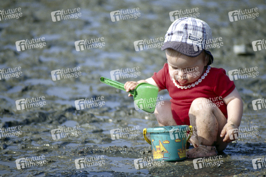 Kleinkind spielt am Meer im Watt mit Schaufel und Eimer