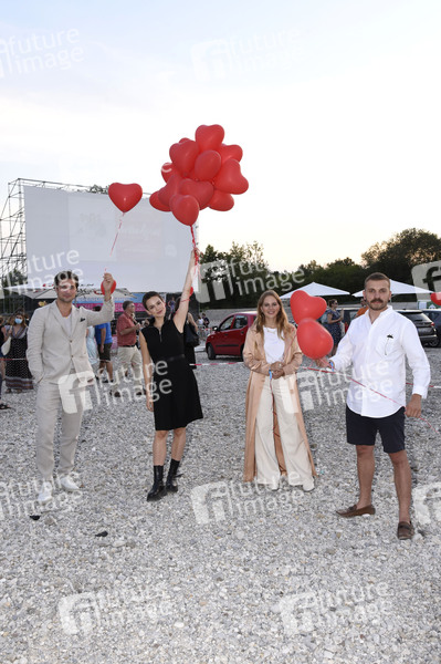 Samuel Schneider, Emilia Schüle, Alicia von Rittberg, Maggie Peren und Edin Hasanovic bei der Premiere des Kinofilms 'Hello Again - Ein Tag für immer' beim Filmfest München Pop-Up im PopUp Autokino auf dem Zenith Parkplatz. München, 12.08.2020