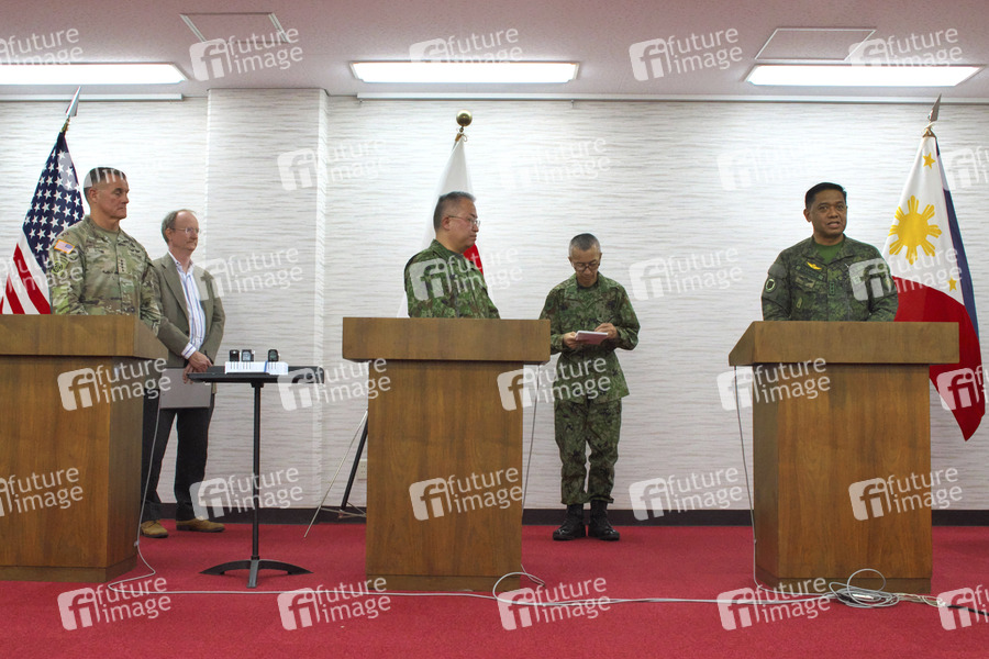 General Charles A. Flynn, General Yoshihide Yoshida und General Romeo S. Brawner Jr. bei einer gemeinsamen Pressekonferenz von Militärs aus Japan, den USA und den Philipinen im Camp Asaka. Tokio, 11.12.2022