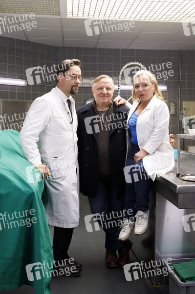 Schauspieler, Schauspielerin, Prof. Karl-Friedrich Boerne und Kriminalhauptkommissar Frank Thiel und Silke 'Alberich' Haller in 'Tatort', Prominenz, TV, Fernsehen, Krimi, Filmset, Fotocall, Photocall, Settermin, Dreharbeiten, TV-Film, Krimireihe, Serie, ARD, Das Erste, WDR, Tatort Münster, Rechtsmedizin