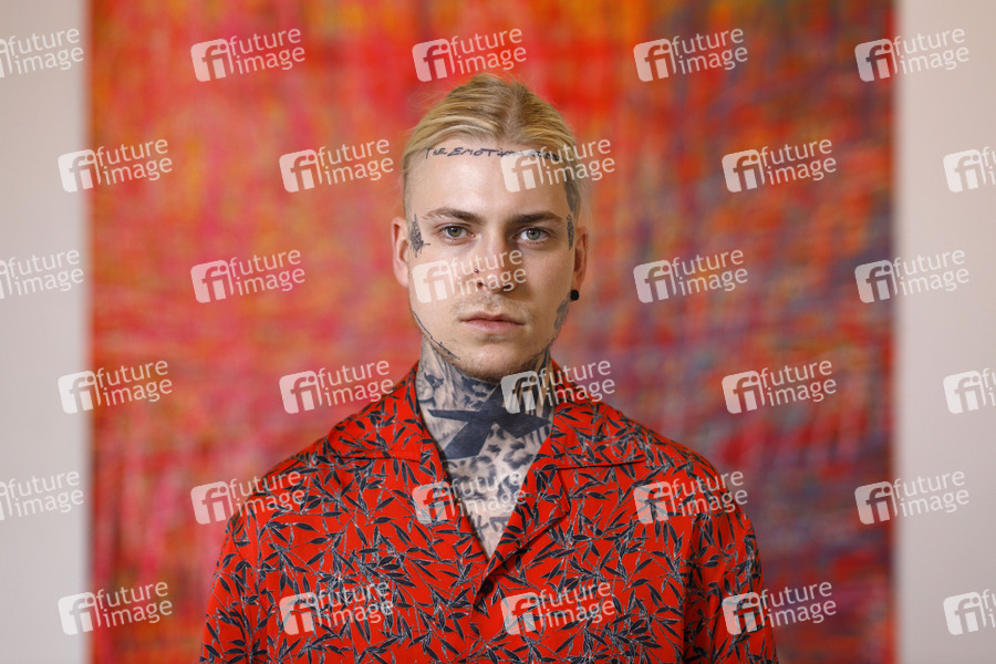 Alexander Höller bei seiner Ausstellung 'Höller - Sturm 2' vor dem Gemälde 'Wald 23' in der Galerie Martina Kaiser. Köln, 21.08.2020