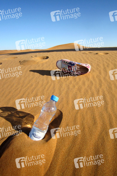 Reise, Urlaub, Sightseeing, Kultur, Sehenswürdigkeit, Wüste, Sand, Schuh, Wasserklasche, Mineralwasser
