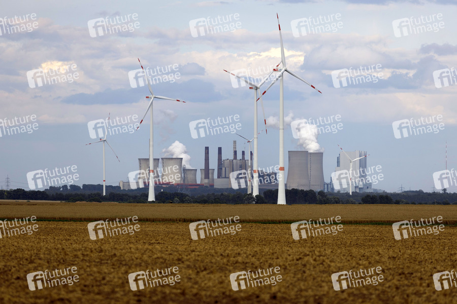 Windräder nahe Garzweiler in NRW mit dem RWE-Kraftwerk Neurath. (Themenbild, Symbolbild) Garzweiler, 15.08.2021