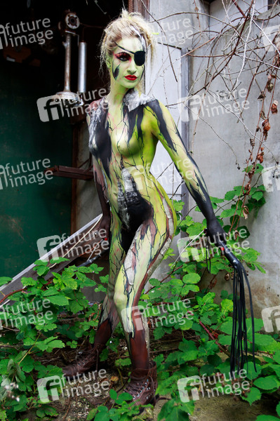 Bodypainting, Erotik, Frau, Mädchen, nackt, draußen, weiblich, Körperkunst, Kunst, Malerei, Augenklappe, Peitsche, erotic, woman, girl, nude, outdoor, female, body art, body painting, eyepatch, whip