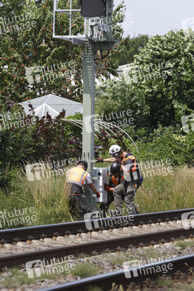 Bahnmitarbeiter bei der Signalinstallation beim Fototermin 'Helikopter fliegt Signalmaste für das neue Elektronische Stellwerk in Bonn-Beuel ein'. Es beginnt letzte große Bauphase vor der Generalsanierung der rechten Rheinstrecke im Jahr 2026. Mit Hilfe eines Helikopters werden knapp 50 Signalmaste für das neue ESTW Bonn-Beuel eingeflogen. Bonn, 14.06.2025