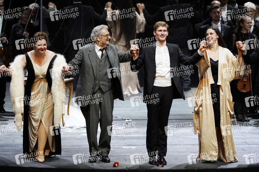 Natalia Skrycka, Placido Domingo, Thomas Guggeis und Zuzana Markova beim Schlussapplaus nach der Aufführung von 'La Traviata' in der Staatsoper Unter den Linden. Berlin, 16.01.2020