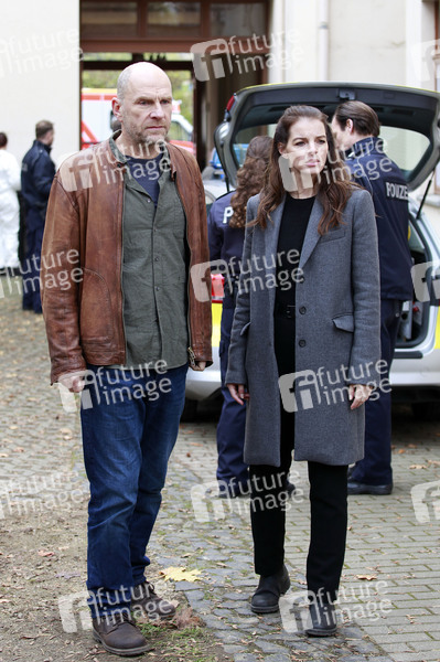 Götz Schubert und Yvonne Catterfeld bei den Dreharbeiten zum Fernsehfilm 'Wolfsland - Kein Entkommen' am Set am Sechsstädteplatz. Görlitz, 08.11.2019