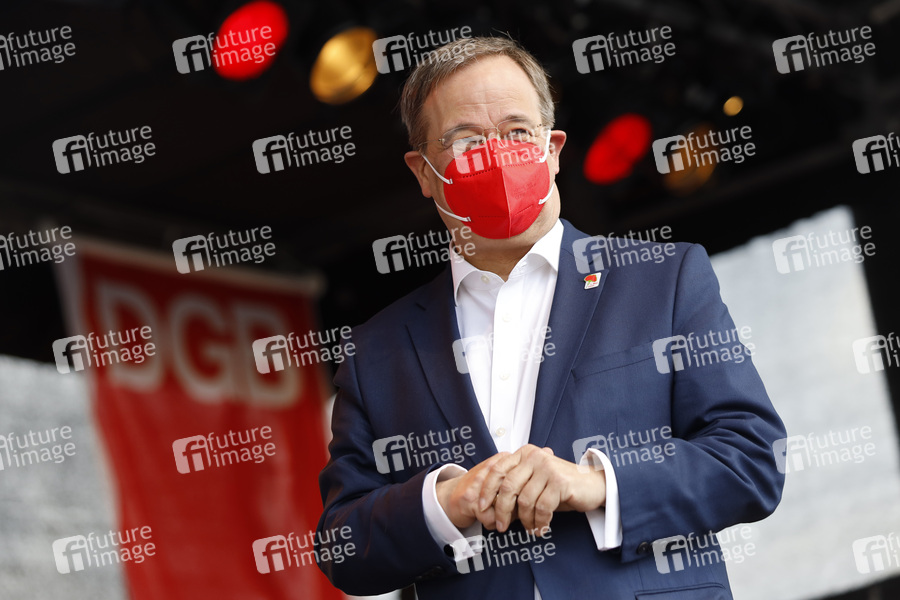 Maske, rote Maske, Maskenpflicht, Politiker, CDU, Ministerpräsident von Nordrhein-Westfalen, Ministerpräsident von NRW, Kanzlerkandidat der Unionsparteien CDU und CSU, Erster Mai, 1. Mai, DGB, Deutscher Gewerkschaftsbund, Gewerkschaften, Gewerkschaftsbund, NRW DGB, NRWDGB, Verdi, Ver.di, Gewerkschaftler, Gewerkschafter, Arbeitnehmervertreter, IGM, IG Metall, Kundgebund, Protest, Arbeitnehmer, Arbeitnehmerinteressen, Lohnarbeit, Arbeitslohn, Tarife, Tarifvertrag, Tarifverträge, Gewerkschaften, Tarifflucht, Tarifstreit, Rente, Arbeiten bis 67, Rente mit 67, Lohn und Brot, Tag der Arbeit, Tarifverhandlungen