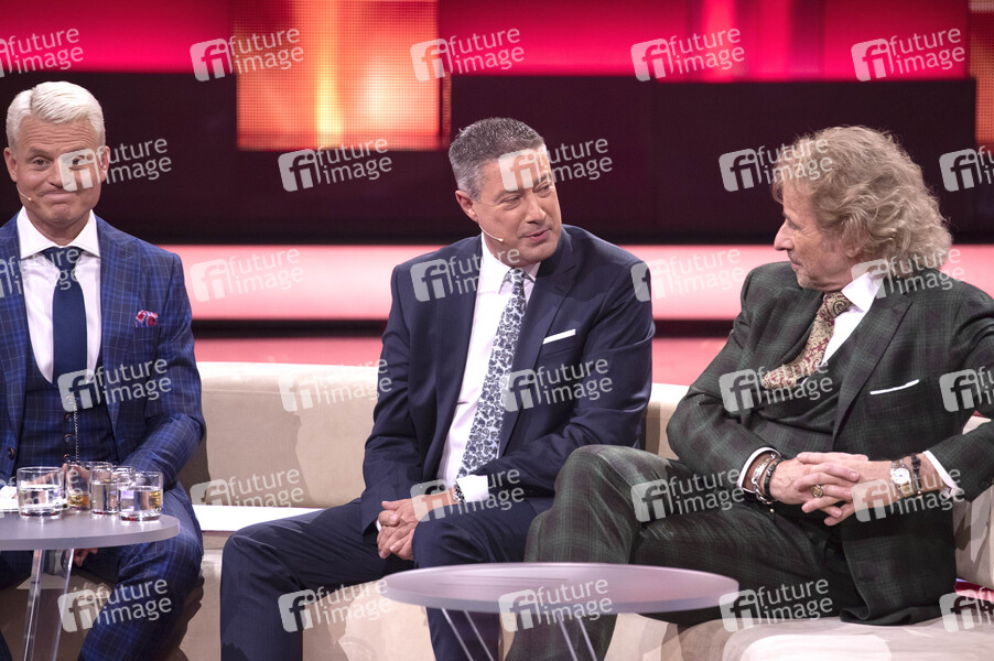 Guido Cantz, Joachim Llambi und Thomas Gottschalk bei der Aufzeichnung der Weihnachtsausgabe der ARD-Unterhaltungsshow 'Verstehen Sie Spass?' in den Bavaria Studios. Geiselgasteig bei München, 16.10.2019
