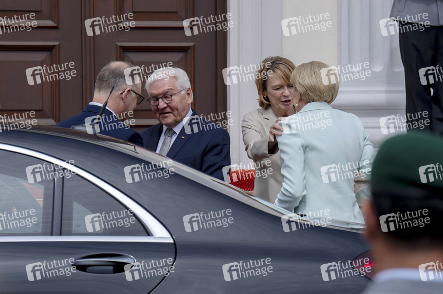 Andrzej Duda, Frank-Walter Steinmeier, Elke Büdenbender und Agata Kornhauser-Duda beim Empfang des polnischen Präsidenten mit militärischen Ehren im Schloss Bellevue. Berlin, 27.05.2025