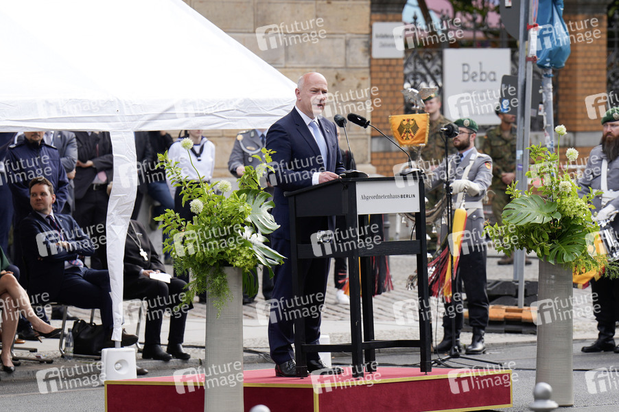 Kai Wegner beim öffentlichen Gelöbnis des Wachbataillons beim Bundesministerium der Verteidigung auf dem Vorplatz des Abgeordnetenhauses von Berlin Berlin, 22.05.2024