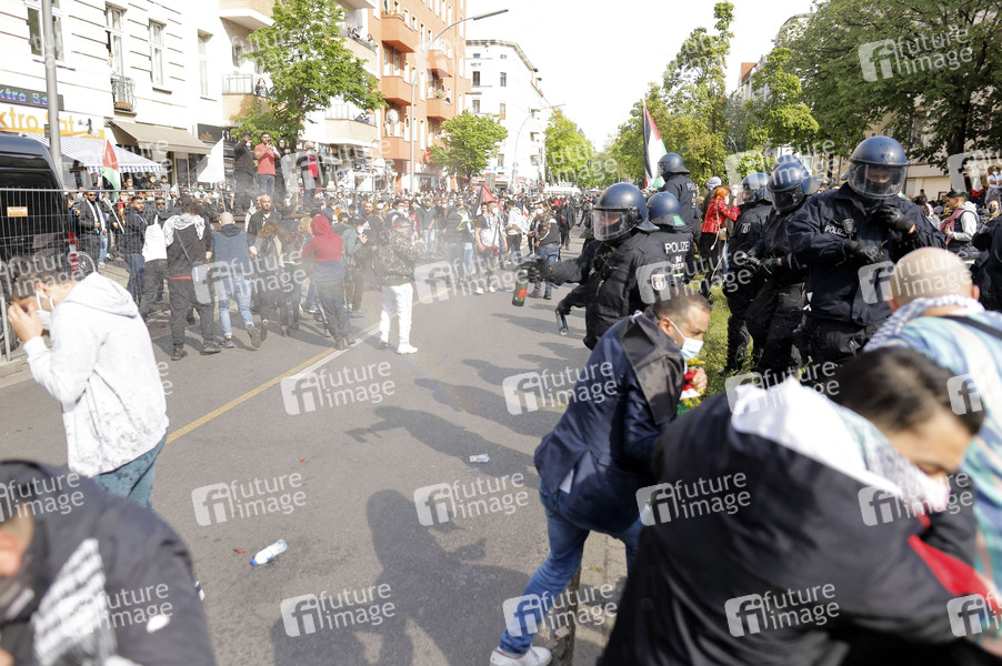 Laut Polizeiangaben demonstrierten Samstag 3500 Menschen in Neukölln bei einer pro-palästinensische Demonstration anlässlich der kriegerischen Auseinandersetzungen in Gaza. Als die Polizei wegen Verstößen gegen die Corona-Hygieneregeln die Demo auflöste, eskalierte die Situation und es kam zu massiven Ausschreitungen. Es gab Festnahmen. Berlin, 15.05.2021