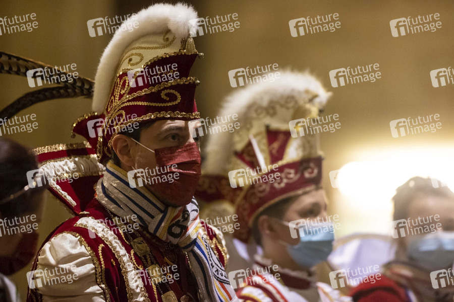 Der karnevalistische Gottesdienst fand unter 3G-Bestimmungen in der Severikirche auf dem Erfurter Domberg statt. Pfarrer Michael Neudert, gab den Karnevalisten, einschließlich den Prinzenpaaren Christian II. und Verena II. und den Kindern Luca I. und Noelanie I. den Segen für die anstehende Kampagne. (Person im Bild: Prinz Christian II.). Erfurt, 16.01.2022