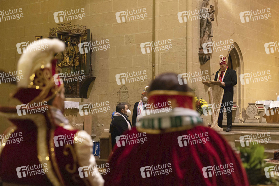 Der karnevalistische Gottesdienst fand unter 3G-Bestimmungen in der Severikirche auf dem Erfurter Domberg statt. Pfarrer Michael Neudert, gab den Karnevalisten, einschließlich den Prinzenpaaren Christian II. und Verena II. und den Kindern Luca I. und Noelanie I. den Segen für die anstehende Kampagne. (Personen im Bild: v.l. Prinz Christian II., Prinzessin Verena II. und Thomas L. Kemmerich.). Erfurt, 16.01.2022