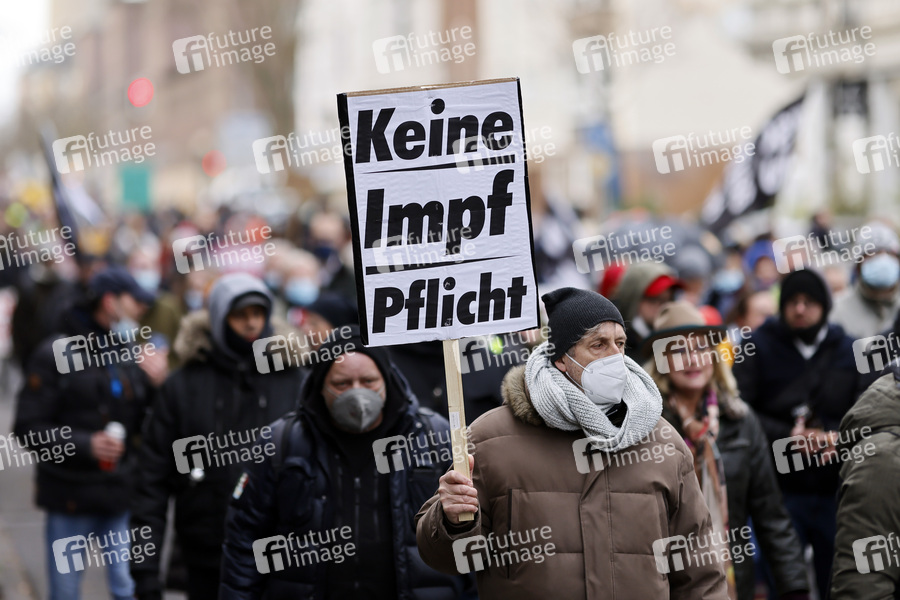 Bei einer angemeldeten Demo unter dem Motto 'Frieden, Freiheit, Selbstbestimmung - Freie Impfentscheidung' demonstrierten etwa 10.000 Gegner einer Impfpflicht mit einem Spaziergang gegen die Corona-Maßnahmen der Bundesregierung und für eine individuelle Impfentscheidung, Grundrechte und 'unversehrte' Kinder - darunter auch viele Pflegekräfte, die wegen der Impfpflicht im Gesundheitsbereich ihren Job zu verlieren drohen. Düsseldorf, 05.02.2022