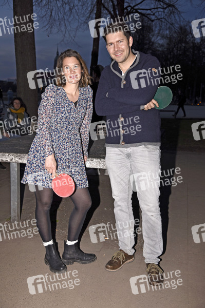 Christina Schmideder und Max Kronseder (DeSchoWieda) beim Videodreh zum Lied 'Radlg'fahrn und G'schmissn' der Guten A-Band im Bavariapark und auf der Theresienwiese. München, 26.03.2021