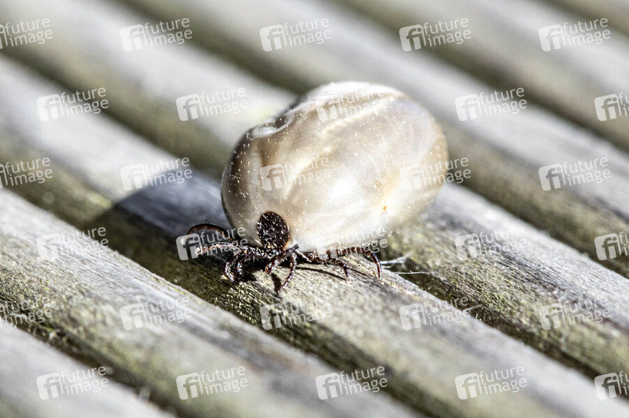 Vollgesogene Zecke. Sommerzeit ist Zeckenzeit. Ein Zeckenbiss kann schwere gesundheitliche Schäden nach sich ziehen. Meersburg, 21.08.2020