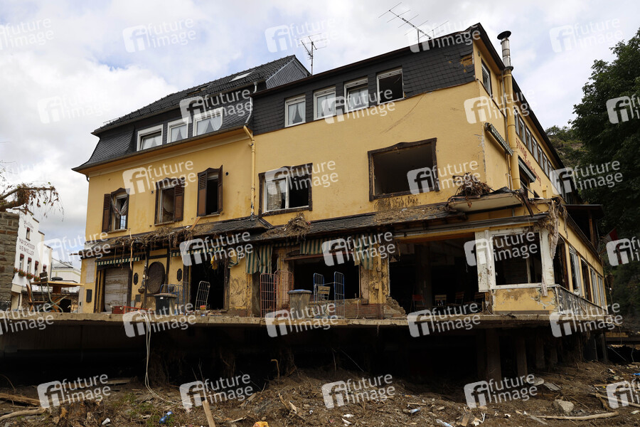 Nach dem Jahrhunderthochwasser in der Eifel durch heftige Regenfälle und Dauerregen mit Überschwemmungen und Überflutungen haben die Aufräumarbeiten im Ahrtal große Fortschritte gemacht. Einheiten von Polizei, THW, Bundeswehr und Feuerwehr mitsamt vielen freiwilligen Helfern haben Straßen geräumt, Schutt und Schlamm entfernt und die Menschen versorgt. Der Wiederaufbau wird trotzdem Jahre dauern. Im Bild Flutschäden in der Ortschaft Mayschoß, in der die Flut viele Häuser zerstörte, 08.08.2021