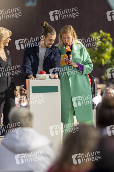 Florian Wünsche und Andrea Kiewel bei der Produktion des 'ZDF-Fernsehgarten on Tour' auf dem Petersberg während er Vorbereitungen zum Tag der Deutschen Einheit unter dem Motto 'Zusammen wachsen'. Erfurt, 30.09.2022