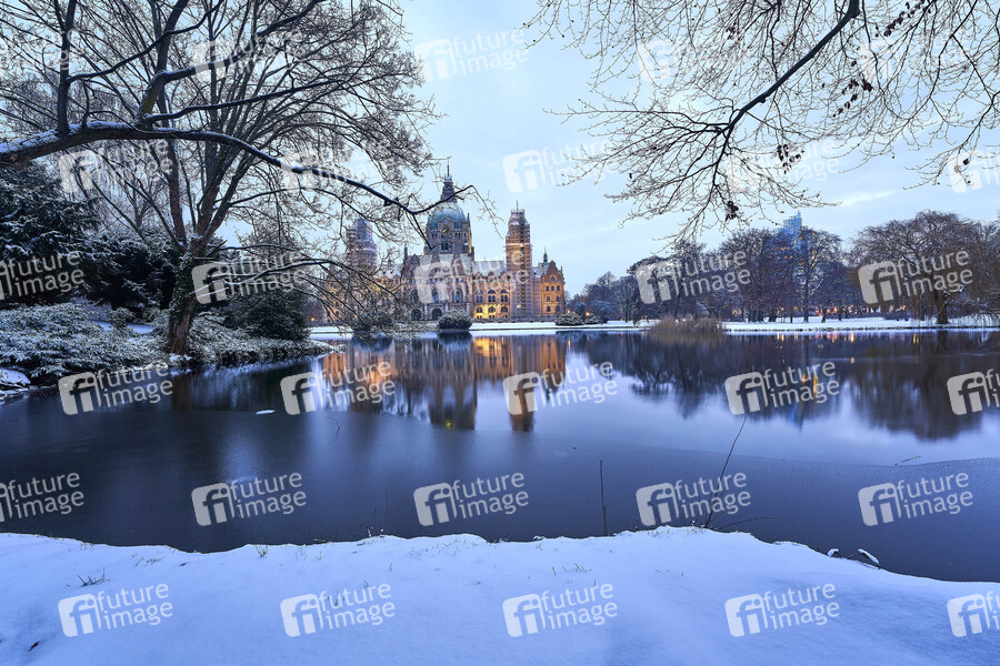 Das Neue Rathaus mit Maschteich im Maschpark an einem Wintermorgen. Hannover, 30.01.2021