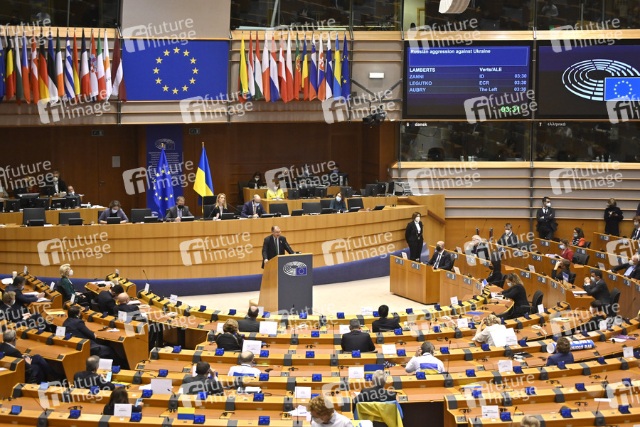 Rede, außerordentliche Sitzung, Sondersitzung, Politik, Europaparlament, EU-Parlament, EP, Parlament der Europäischen Union, Parlamentum Europaeum, MdEP, Mitglied des Europäischen Parlaments, Krieg, Angriffskrieg, Einmarsch, Europapolitik, internationale Krise, internationale Politik, internationales Recht, Konflikt, Krieg, Kriegsbeginn, Kriegsverbrechen, Krise, Militäroffensive, Militärschlag, Sanktionen, Solidarität, Solidaritätsbekundung, Ukraine, Ukrainekonflikt, Ukraine-Konflikt, Ukrainekrise, Ukraine-Russland-Krise, Politiker, Belgien, Ecolo, Co-Vorsitzender der Fraktion Die Grünen/EFA