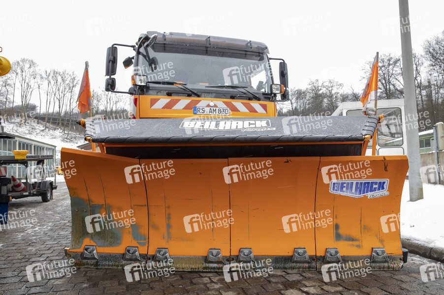 Multifunktionales Fahrzeug mit Schneepflug als Schneeräumfahrzeug im Winterdienst beim Fototermin mit freundlicher Genehmigung der BDL Leitung des Betriebsdienstes der Autobahnmeisterei Remscheid. Remscheid, 10.02.2021