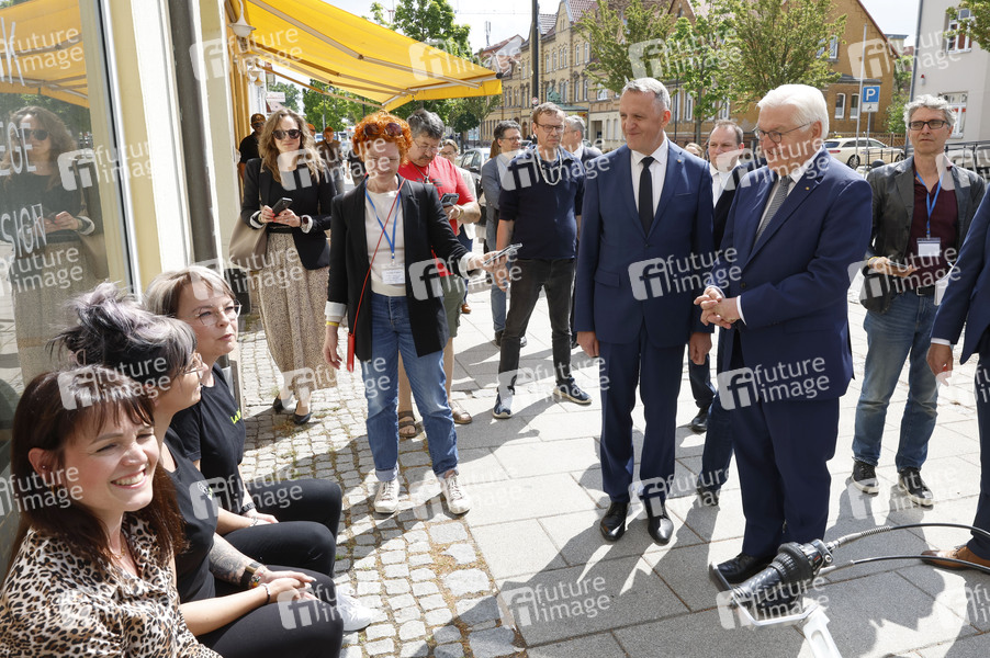 Frank-Walter Steinmeier mit Bürgermeister Manfred Wilde auf dem Weg durch die Stadt Delitzsch zum Rathaus. Steinmeier verlegt seinen Amtssitz für drei Tage nach Sachsen. Der Besuch im Landkreis Nordsachsen ist Teil der Reihe 'Ortszeit Deutschland', bei der das Staatsoberhaupt regelmäßig in verschiedene Regionen reist, um mit Bürgerinnen und Bürgern ins Gespräch zu kommen und die Entwicklung vor Ort kennenzulernen. Delitzsch, 20.05.2025