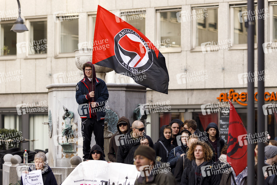 Anhänger der Antifa demonstrieren gegen einen Informationsstand der rechten Gruppe 'Widerstand steigt auf' unter dem Namen 'Citadelle e.V.' am Hans-Hartmann Platz. Köln, 15.02.2020