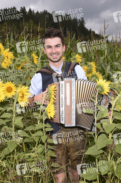 Entertainment, Prominenz, Celebrities, Celebrity, Homestory, Musiker, Akkordeonspieler, Sänger, Nachwuchskünstler in der volkstümlichen Musik, Schwarzhof, Bauernhof, Sonnenblumen, Sonnenblumenfeld