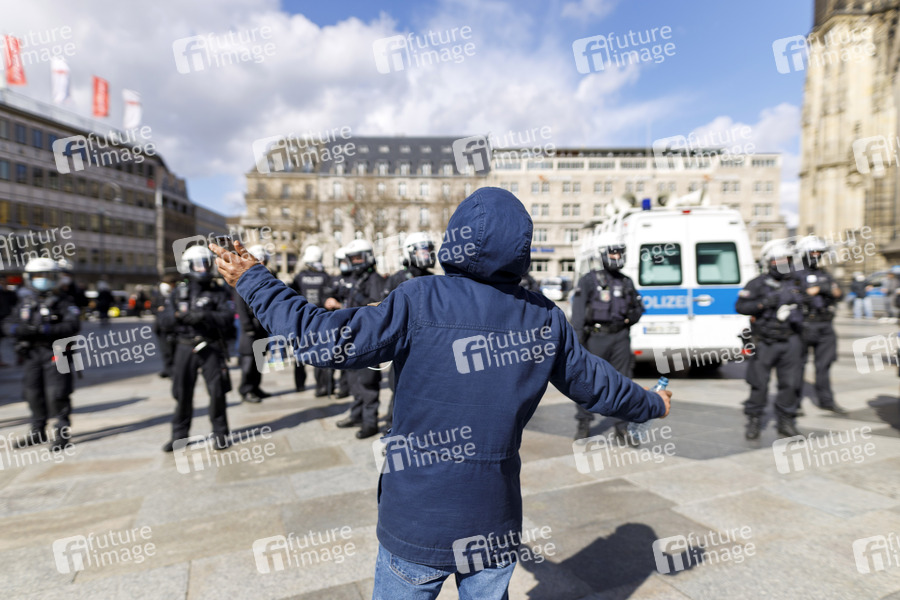 Eine unangemeldete Demo von Kritikern der Corona-Maßnahmen vor dem Kölner Dom wurde durch die Polizei aufgelöst. Die Demonstranten hatten sich ohne Masken und Mindestabstand versammelt und Parolen wie 'Widerstand! Widerstand!' skandiert. Die Teilnehmer protestieren gegen die aus ihrer Sicht überzogenen Corona-Maßnahmen und fürchten die Etablierung einer Corona-Diktatur. Köln, 27.03.2021