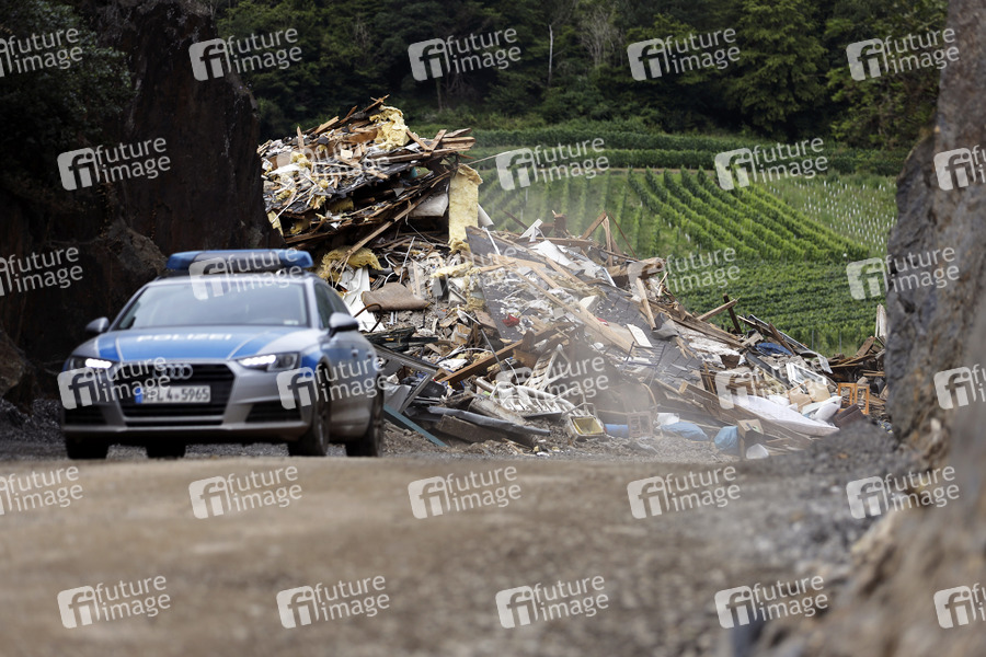 Nach dem Jahrhunderthochwasser in der Eifel durch heftige Regenfälle und Dauerregen mit Überschwemmungen und Überflutungen haben die Aufräumarbeiten im Ahrtal große Fortschritte gemacht. Einheiten von Polizei, THW, Bundeswehr und Feuerwehr mitsamt vielen freiwilligen Helfern haben Straßen geräumt, Schutt und Schlamm entfernt und die Menschen versorgt. Der Wiederaufbau wird trotzdem Jahre dauern. Im Bild Flutschäden in der Ortschaft Mayschoß, in der die Flut viele Häuser zerstörte, 08.08.2021