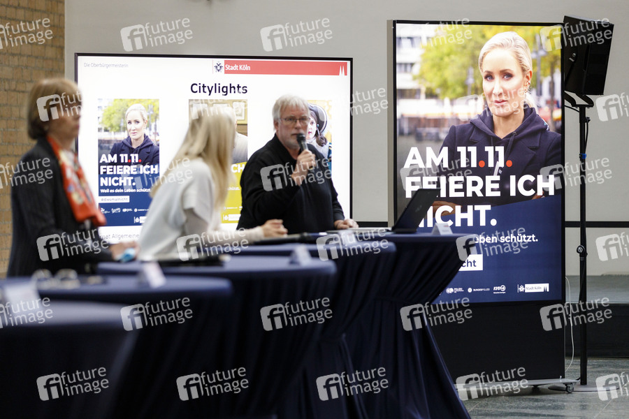 Motive der Corona-Kampagne mit Janine Kunze auf der Corona-Pressekonferenz im Kölner Rathaus. Der Kölner Karneval wird wegen der rasant steigenden Infektionszahlen nicht iwie gewohnt stattfinden: In einer gemeinsamen Erklärung verkündeten Stadt und Festkomitee, dass am 11.11. im Kölner Stadtgebiet ein Alkoholverbot gelte, zudem solle die Kampagne '11.11. und Karneval in Zeiten von Corona' starten. Köln, 27.10.2020