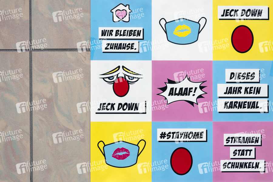 Eine Plakatkampagne stimmt die Kölner darauf ein, an Karneval wegen der Corona-Pandemie zu Hause zu bleiben. An Karneval gilt ein Alkoholkonsumverbot und ein Alkoholabgabeverbot, der traditionelle Rosenmontagszug findet nur virtuell in einer Puppenversion statt. (Themenbild, Symbolbild) Köln, 05.02.2021