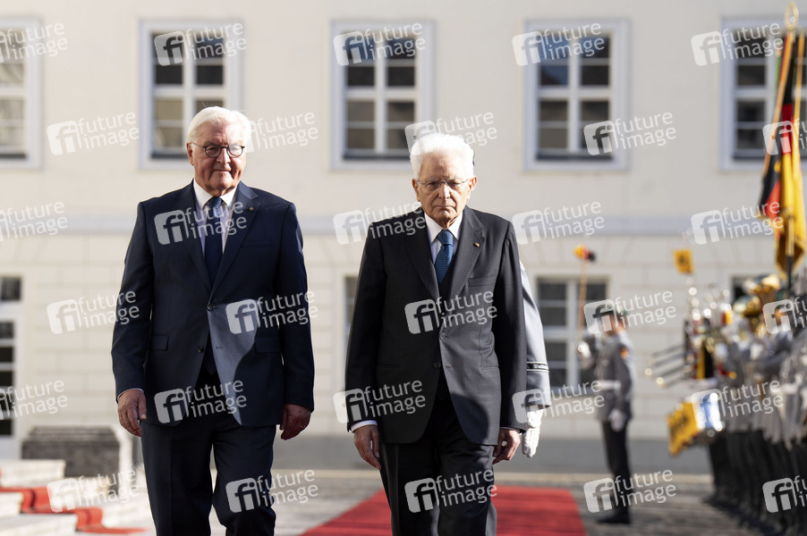 Frank-Walter Steinmeier und Sergio Mattarella beim Empfang des italienischen Staatspräsidenten mit militärischen Ehren im Schloss Bellevue. Berlin, 27.09.2024