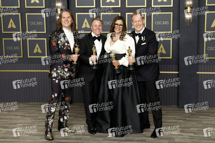 Jared Bush, Byron Howard, Yvett Merino und Clark Spencer mit Oscars für den besten Animationsfilm 'Encanto' im Press Room der Oscar Verleihung 2022 / 94th Annual Academy Awards im Hollywood & Highland Center. Los Angeles, 27.03.2022