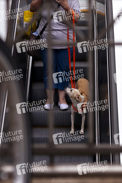 Ein Hund schaut auf einer Rolltreppe ängstlich zu seiner Herrin. Köln, 19.05.2020