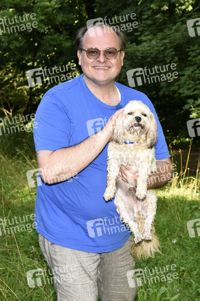 Markus Majowski mit Hund Utzy bei der Fotoprobe zum Theaterstück 'Ungeheuer heiß' auf der Freiluftbühne im Gastgarten Siebenbrunn. München, 27.07.2021