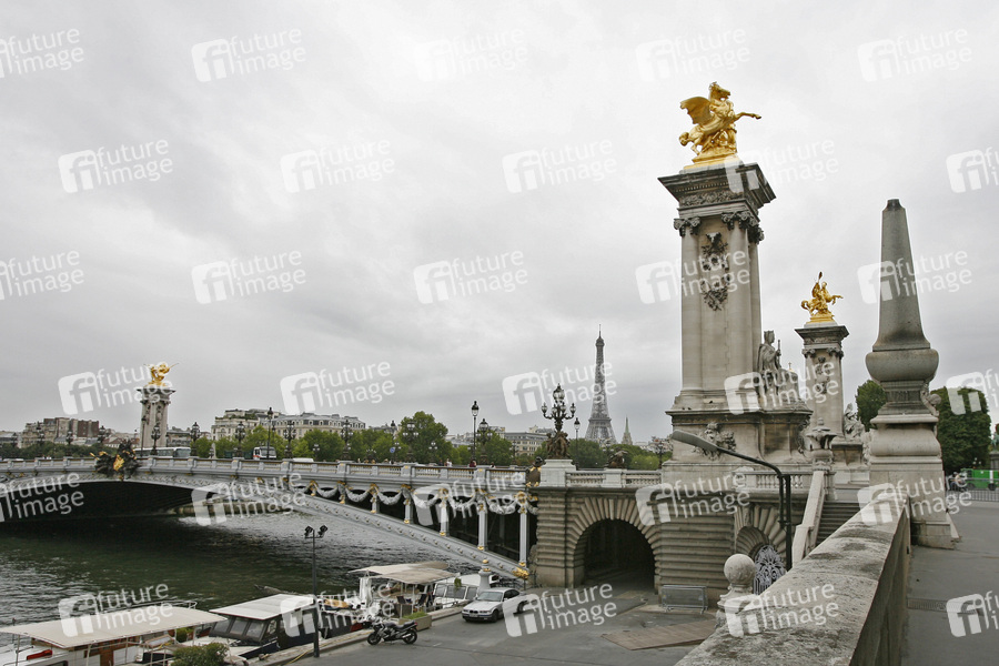 die 115 m lange Brücke wurde als Zeichen der Französisch-Russischen Freundschaft im Neobarock errichtet und trägt den Namen des Zaren Alexander III., die Errichtung begann 1897 und wurde zur Weltausstellung im Jahre 1900 in Paris fertig, Seine, Eiffelturm