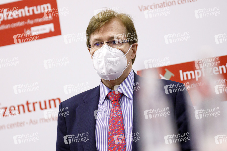 Peter Biesenbach auf der Pressekonferenz: Der NRW-Justizminister auf Werbetour in Köln für die Kampagne des Weissen Rings zum Thema 'Kein Anschluss für Betrüger am Telefon' im Impfzentrum in den Messehallen. Auch dort sollen Plakate die alten Menschen vor der Enkeltrick-Masche warnen, die ohnehin die Messehallen für einen Impftermin aufsuchen. Köln, 05.02.2021