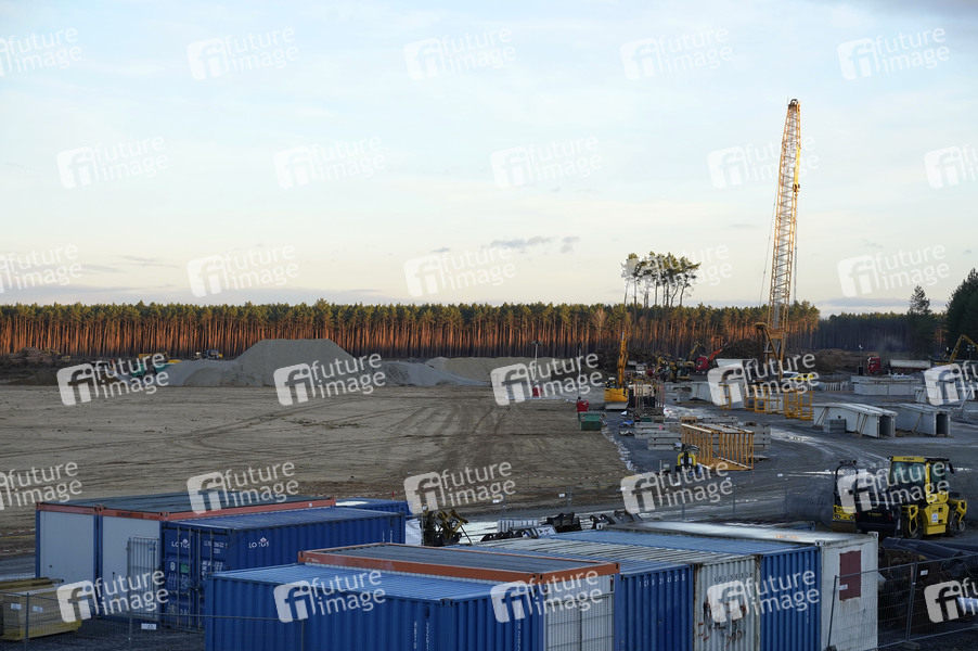 Elektroauto, Elektrofahrzeuge, PKW, Auto, Model Y, Model 3, Großfabrik, Automobilhersteller, Autobauer, Elektromobilität, umweltfreundlich, vorläufige Genehmigung, Batteriefabrik, Großprojekt, Investition, Baugenehmigung, Vorab-Genehmigung, E-Auto-Fabrik, Umwelt, Klimaschutz, Baustelle, Bauen, Baubranche, Bau-Branche, Bauarbeiten, Großbaustelle, Kran, Kräne, Baustelle, Wirtschaft, Autoproduktion