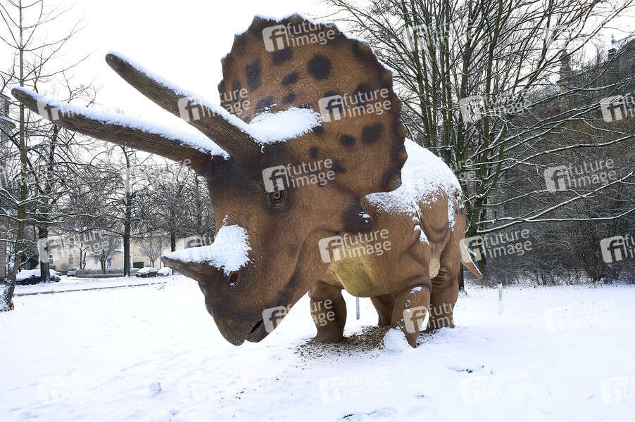 Verschneiter Dinosaurier am Landesmuseum zur Sonderausstellung 'Kinoaaurier. Zwischen Fantasie und Forschung'. Hannover, 30.01.2021
