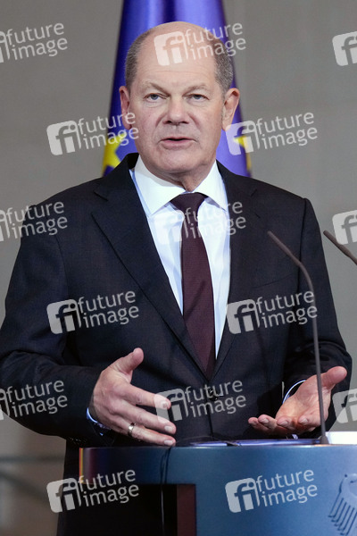 Olaf Scholz beim Empfang des Ministerpräsidenten der Republik Polen mit militärischen Ehren zu einem gemeinsamen Gespräch mit dem Bundeskanzler und anschließendem Pressestatement im Bundeskanzleramt. Berlin, 12.02.2024