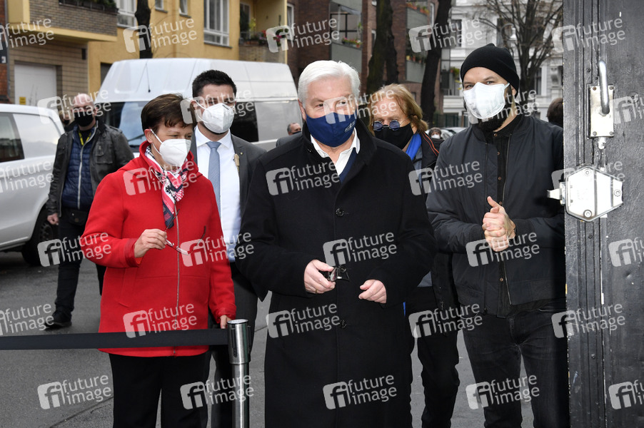 Ulrike Kostka, Bundespräsident Frank-Walter Steinmeier und Frank Zander verteilen Essen und Geschenke aus dem Food Truck an Obdachlose und Bedürftige. Berlin, 16.12.2020