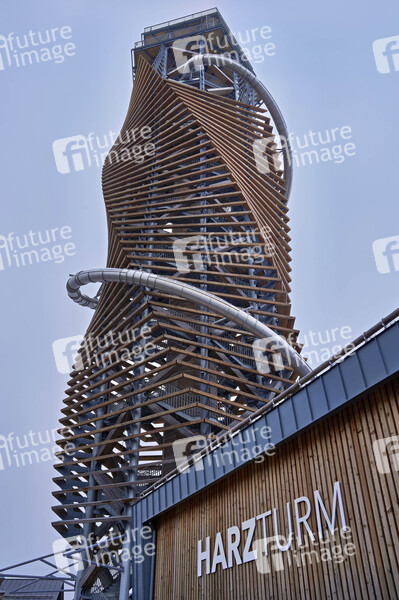 Der Harzturm ist ein 65 Meter hoher Aussichtsturm im Harz. Über eine Treppe oder einen Aufzug sind auf 45 Metern Turmhöhe zwei Panoramaplattformen, ein Skywalk mit gläsernem Boden und der Startpunkt einer 110 Meter langen Rutsche zu erreichen. Die hölzerne Turmschraube imitiert einen hohlen, drehwüchsigen Baumstamm. Dafür haben sich die österreichischen Planer, Architekt Dietmar Kaden und Tragwerksplaner Markus Lackner, das intelligente Naturdesign des aufgehenden Fichtenzapfens zum Vorbild genommen. Torfhaus, 25.02.2024