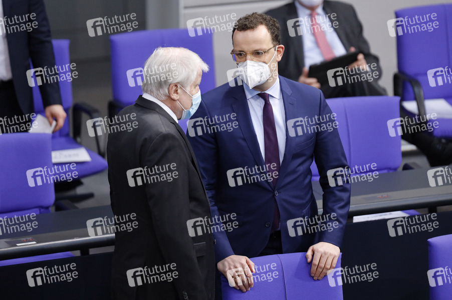 Horst Seehofer und Jens Spahn in der 203. Sitzung des Deutschen Bundestages im Reichstagsgebäude. Berlin, 13.01.2021