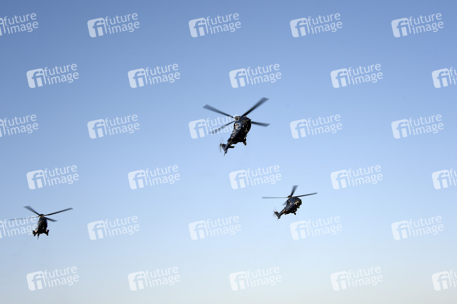 Die Hubschrauber der Bundespolizei fliegen eine Ehrenrunde zum Abschied. Mit der Inbetriebnahme des Flughafens Berlin Brandenburg Willy Brandt (BER) wird der gesamte Luftverkehr der Hauptstadtregion an einem Standort konzentriert. Der Flughafen Tegel, kurz TXL, schließt am 8. November. 60 Jahre nach dem ersten Linienflug von Air France wird am 8. November ein Flugzeug der französischen Airline zum allerletzten Mal von dem Flughafen im Nordosten Berlins starten und Adieu sagen. Berlin, 08.11.2020