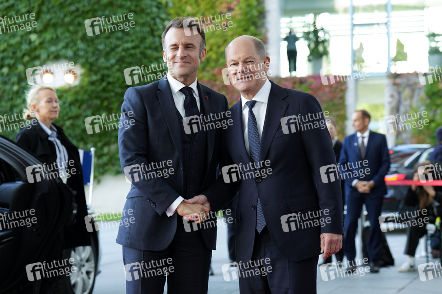 Emmanuel Macron und Olaf Scholz bei der Ankunft zum QUAD Treffen anlässlich des Besuchs des amerikanischen Präsidenten Joe Biden im Bundeskanzleramt. Berlin, 18.10.2024