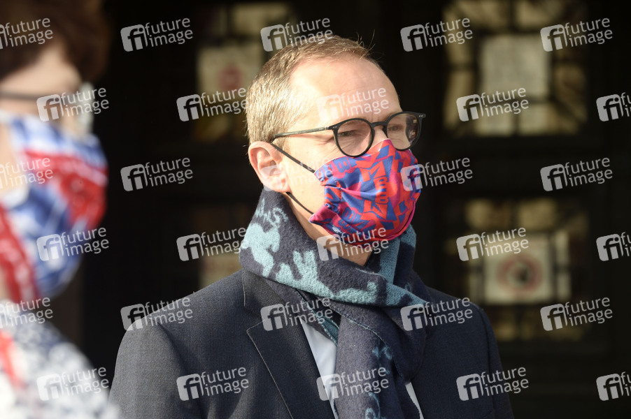 Michael Müller beim Gedenkmoment zum 12 Uhr-Glockenschlag der Freiheitsglocke im Turm des Schöneberger Rathauses mit Gebindeniederlegung aus Anlass des 70-jährigen Jubiläums des ersten Glockenschlags vor dem Rathaus Schöneberg. Berlin, 24.10.2020