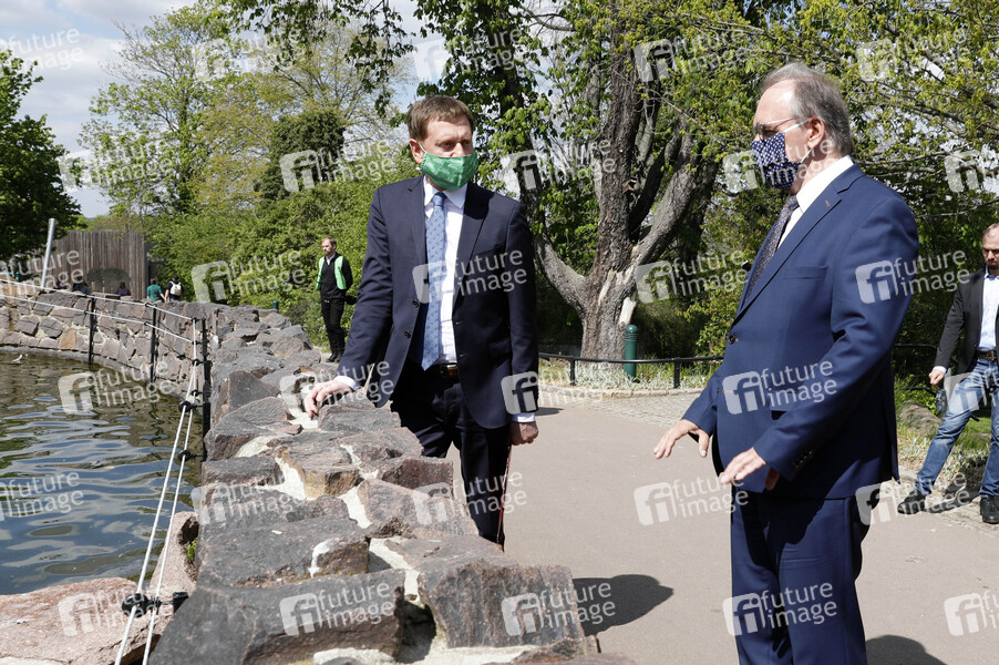 Michael Kretschmer und Reiner Haseloff beim Pressegespräch über das weitere Vorgehen in der Corona-Pandemie im Zoo Halle. Halle (Saale), 26.04.2020