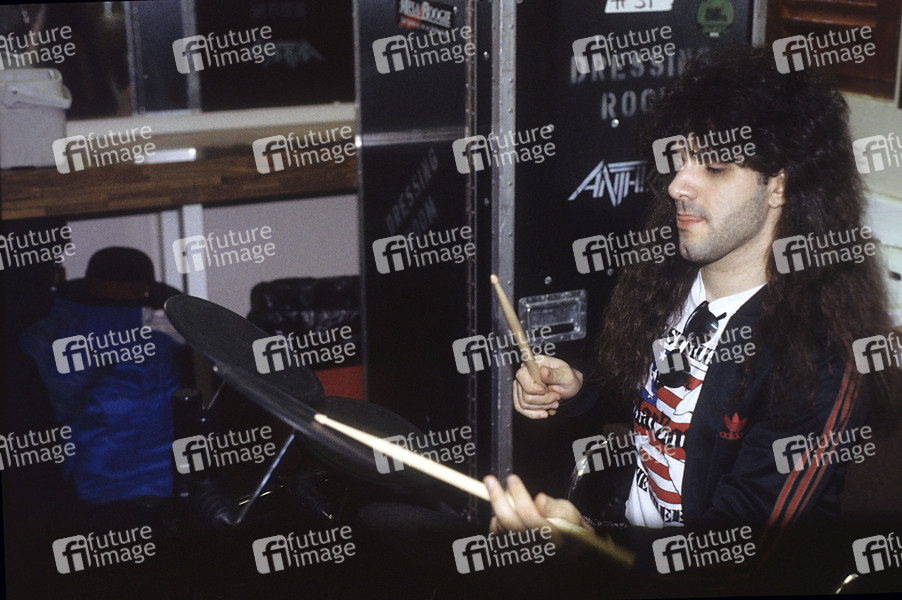 Charlie Benante von Anthrax bei einem Photoshooting Backstage im Hammersmith Odeon. London, 13.03.1989